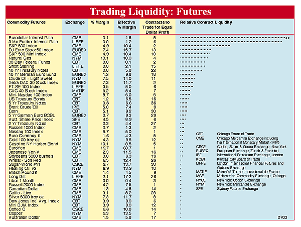 Trading Liquidity: Futures is a reference chart for speculators. It compares markets according to their per-contract potential for profit and how easily contracts can be bought or sold (i.e., trading liquidity). Each is a proportional measure and is meaningful only when compared to others in the same column. The number in the "Contracts to Trade for Equal Dollar Profit" column shows how many contracts of one commodity must be traded to obtain the same potential return as another commodity. Contracts to Trade = (Tick $ value) x (3-year Maximum Price Excursion). "Relative Contract Liquidity" places commodities in descending order according to how easily all of their contracts can be traded. Commodities at the top of the list are easiest to buy and sell; commodities at the bottom of the list are the most difficult. "Relative Contract Liquidity" is the number of contracts to trade times total open interest times a volume factor, which is the greater of: 1 or exp (1n (volume) / 1n (5000)) - 2.