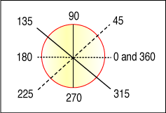GANN GEOMETRIC FORMSW.D. Gann used basic forms of geometry: squares, circles, and triangles. Let's look at circles first. A circle has 360 degrees, and this number, along with fractions of 360, is widely present in Gann's research. In order to reach his time targets, he extrapolated 30, 90, 120, 180, and 360 days from significant chart points. These forward periods are potential reversal dates. The secondary reversal dates are 45, 135, 225, and 315. (See Figure 1.)
