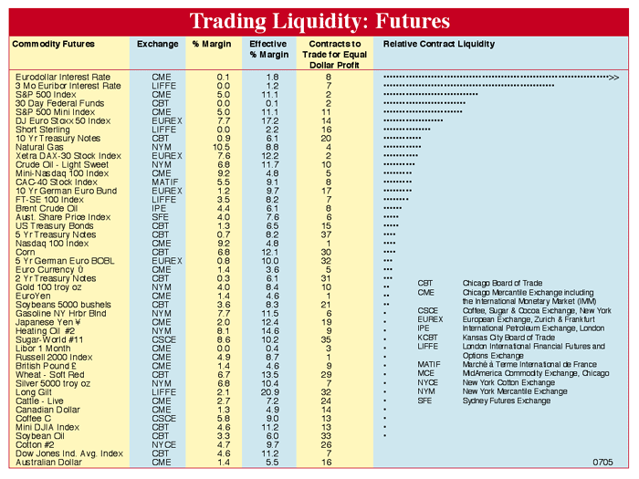 Trading Liquidity: Futures is a reference chart for speculators. It compares markets according to their per-contract potential for profit and how easily contracts can be bought or sold (i.e., trading liquidity). Each is a proportional measure and is meaningful only when compared to others in the same column. The number in the "Contracts to Trade for Equal Dollar Profit" column shows how many contracts of one commodity must be traded to obtain the same potential return as another commodity. Contracts to Trade = (Tick $ value) x (3-year Maximum Price Excursion). "Relative Contract Liquidity" places commodities in descending order according to how easily all of their contracts can be traded. Commodities at the top of the list are easiest to buy and sell; commodities at the bottom of the list are the most difficult. "Relative Contract Liquidity" is the number of contracts to trade times total open interest times a volume factor, which is the greater of: 1 or exp (1n (volume) / 1n (5000)) - 2.