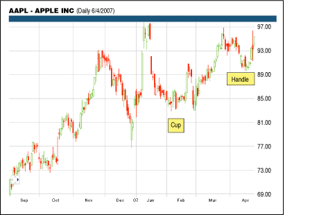 FIGURE 1: A TYPICAL CUP & HANDLE PATTERN. On this daily chart of Apple, Inc. (AAPL), you can clearly see what the cup & handle formation looks like. Note it resembles an ascending triangle.What are the characteristics of this pattern? A cup & handle can sometimes be taken out of context and labeled as an ascending triangle. To properly qualify as a cup & handle, the cup must be round. There's a strong chance it may have some jagged movement such as what you see in Figure 2, but in general, the length and roundness of the cup is what confirms the formation.