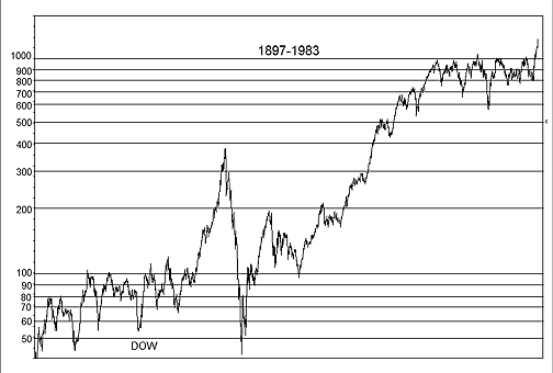 FIGURE 1: DOW JONES INDUSTRIAL AVERAGE (1897-1983). Note the similarities in action between the DJIA when it hit 100 and when it hit 1000.Figure 2 shows that nearly every peak or trough since 1962 occurred at a time when a popular index was hitting or nearing a big round number. Round numbers that are followed by different numbers of zeroes are considered psychologically equivalent, and those providing the greatest resistance or support are those beginning with "1." The DJIA peaked first when it was nearing 1000 in 1966 and fell 25%.