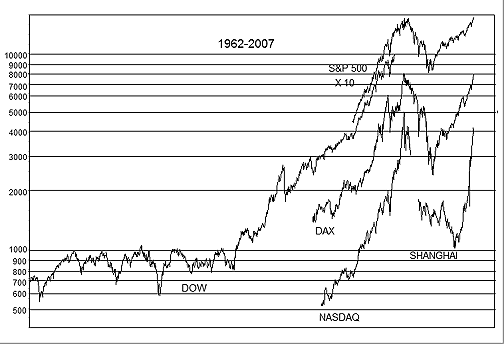 FIGURE 2: DOW JONES INDUSTRIAL AVERAGE (1962-2007). Nearly every peak or trough since 1962 occurred at a time when a popular index was hitting or nearing a big round number.It gradually recovered to peak again near 1000 in 1968, and fell 35%. It broke just above 1000 in 1973, peaked again, and fell to bottom just after penetrating 600. It rose again to bounce repeatedly just above 1000 in 1976 and fell 25%. It rose to peak at 1000 again in 1981, and bottomed with three lows near 800. It then broke above the resistance around 1000. In 1987, it passed through 2000, apparently being steered by traders in the new index futures toward a Fibonacci target around 2700. The DJIA nearing 3000 in 1990 was followed by a brief bear market. Nearing 4000 with the NASDAQ Composite hitting 800 was followed by the flat bear market of 1994.