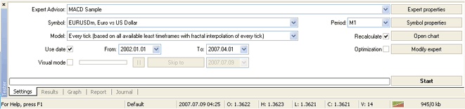 The first thing I did was choose a system to test. The moving average convergence/divergence (MACD) sample that comes by default with MetaTrader is available for free and everyone who uses MetaTrader has access to it. Using the default settings on the MACD sample, I ran a simulation on a one-minute chart of EUR/USD from January 1, 2002, to April 1, 2007, using every tick option (Figure 1). The results are displayed in Figure 2.