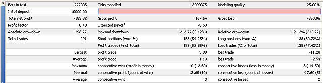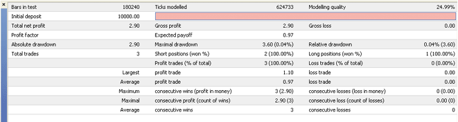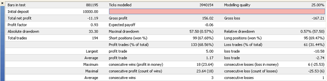 FIGURE 2: RESULTS OF SIMULATION OF MACD SAMPLE. The modeling quality was only 24.97%. As you can see, the modeling quality was only 24.97%, which implies I did not have enough data to begin with. Note, however, that this was the data I had by default.