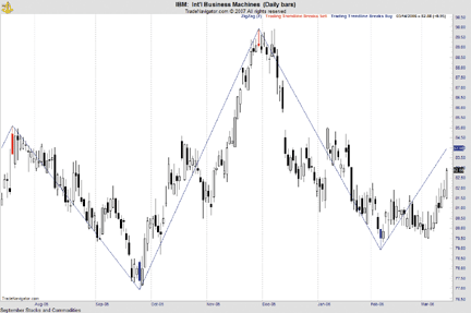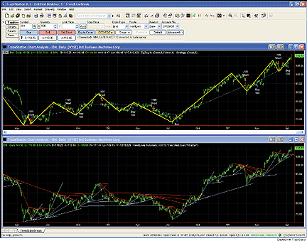 FIGURE 1: TRADESTATION, TRADING TRENDLINE BREAKS. The strategy "ZigZag Percent," applied to a daily chart of IBM, is displayed in the upper panel. The yellow trendlines are drawn by one of TradeStation's built-in indicators, "ZigZag %". Both the strategy and the indicator use a 5% reversal to identify peaks and troughs. The lower pane displays the built-in "TrendLines Automatic" indicator, again applied to a daily chart of IBM.TradeStation has a number of built-in studies for creating and trading trendlines. For example, the indicator "Trendlines Automatic" creates trendlines much like those described in the articles. The built-in strategies "TrendLine LE" and "TrendLine SE" provide long and short entries that are based on manually drawn trendlines. The EasyLanguage Library in TradeStation's online Support Forum contains other trendline-based strategies, including "TL_Entry," "TL_ProfitTarget," and "TL_StopLoss." Each of these strategies uses a manually drawn trendline to control trades. See, for example, the code at the following link:Code for a strategy named "ZigZag Percent" is shown here. To download this code, go to the Support Center at TradeStation.com. Search for the file "ZigZag_Percent.Eld."https://www.tradestation.com/Discussions/Topic.aspx?Topic_ID=5863TradeStation does not endorse or recommend any particular strategy.