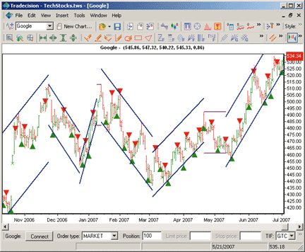 FIGURE 10: TRADECISION, TRENDLINE BREAKS. Here, Sylvain Vervoort's trendline breaks strategy is applied to a Google daily chart along with the auto-trends study.Entry Long