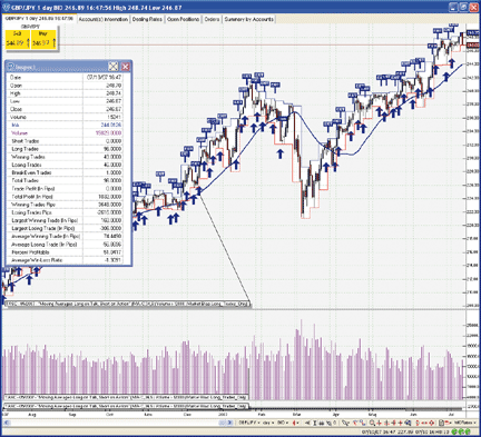 FIGURE 12: VT TRADER, TRONGONE MOVING AVERAGE FOR FOREX. Here is a GBP/JPY daily candlestick chart with the TMA trading system displayed. The Inspect Window displays some basic profit/loss statistics produced by the TMA system over the last 500 days.We'll be offering our modified Trongone MA trading system for download in our user forums. The VT Trader code and instructions for creating it are as follows (the input variables are parameterized to allow customization):