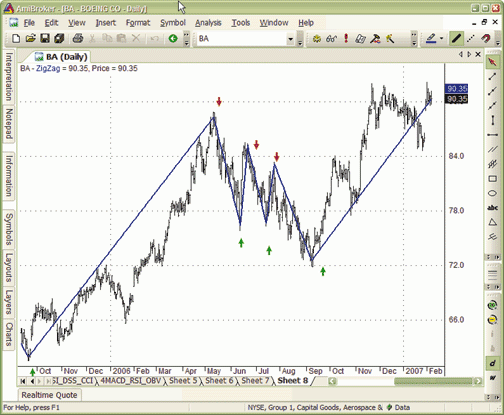 FIGURE 3: AMIBROKER, TRENDLINES. This screenshot shows a daily chart of Boeing (BA), with a 7% zigzag line, and buy (green)/sell (red) arrows generated by the AmiBroker formula listing.--Tomasz Janeczko, AmiBroker.com
