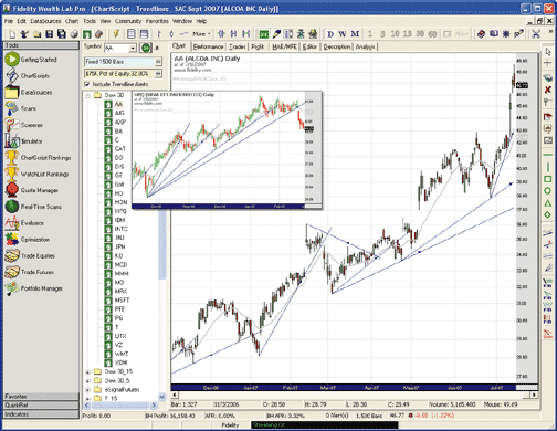 The cherry-picked chart of AA in Figure 4 shows just how well the study can actually work. It's quite common, however, to see the phenomenon shown on the HPQ chart inset, in which a trendline is drawn, crossed, redrawn, crossed, and so on. Note that a trendline is not attempted to be redrawn in the same direction after a crossing until a specified number of bars have passed.