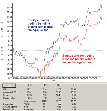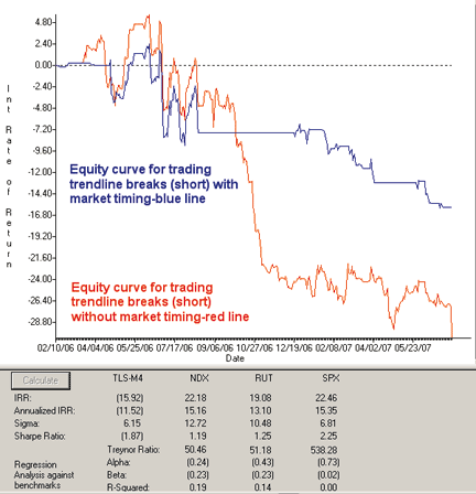 FIGURE 7: AIQ, TRADING TRENDLINE BREAKS, SHORT. Here is an equity curve comparison for trading trendline breaks short related to classic chart patterns with and without a market timing filter.