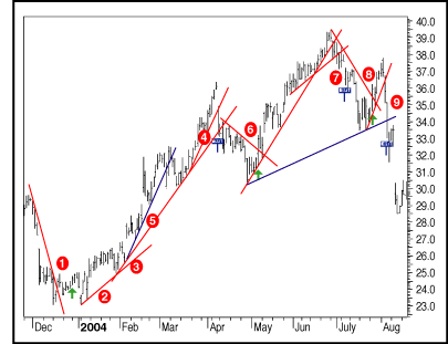 In the first part of this series, we examined the application of trendline breaks. In the second part, we studied a basic system for creating trendlines. This, the third and final part of this series, takes a detailed look at how the system can be applied.Previously, I discussed how trendlines are plotted and how they can be used. This time, I am going to show you Abercombie & Fitch Co. (ANF). The numbers here represent the labels on the chart displayed in Figure 1:
