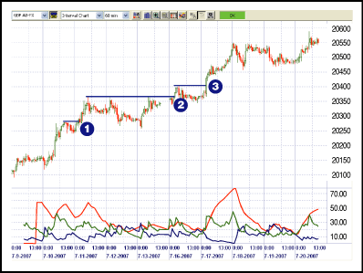 FIGURE 1: GBP/USD HOURLY. Here you see long breakout signals indicated by the combination of bullish cup breakouts accompanied by ADX > 40 values....Continued in the October issue of Technical Analysis of STOCKS & COMMODITIES