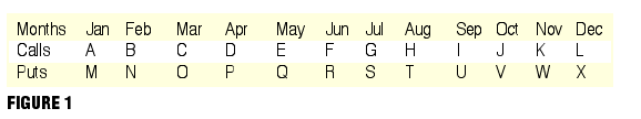 The second part of the symbol is the expiration month. Since there are 12 months and therefore 12 expirations in the option market, there are a dozen each monthly symbols for calls (A-L) and puts (M-X). Figure 1 shows how puts and calls are assigned letter symbols based on their expiration months.