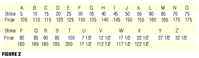 The final part of the option symbol is the strike price. Each strike price (at five-point increments) has a unique letter. Figure 2 shows how it works. Options with a strike price of 10 (or 110) will have a B at the end of their symbol. Options with a strike price of 27.5 will generally have a Y at the end of theirs.
