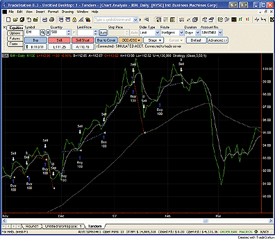 FIGURE 1: TRADESTATION, ACCUMULATION RANGE RATIO. In this sample TradeStation chart, the TandemStudy strategy is applied to a daily chart of IBM. The gray lines display the short and long moving averages, which define market phases. To simplify the display, the IBM price data is plotted as a line connecting the daily closing prices.Four phases are defined by the relative positions of the current close and two moving averages. Long positions are entered only while the shorter-duration moving average is above the longer-duration average. If the close crosses over the shorter average, a strong upward phase has been entered, according to Vonko. If the close crosses under the shorter moving average, a weak phase has been entered. The duration of each phase is recorded and used to produce an "accumulation range ratio." This ratio filters possible entries at the beginning of a new strong upward phase. Finally, the duration of the primary phase is used as another entry filter. The code allows for optimization of the two average lengths, the accumulation range threshold, and the duration weight.To download the code, go to the Support Center at TradeStation.com. Search for the file "Tandem.ELD." TradeStation does not endorse or recommend any particular strategy.