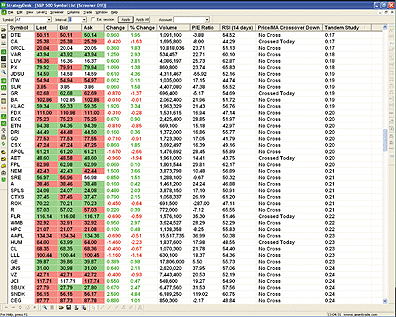 When I applied all these rules to the S&P 500, I captured an overall bullish phase that began 6/14/06 and is still active as of 8/10/07. Within this major uptrend, there are two bullish sub-phases (06/14/06 to 02/22/07 and 03/14/07 to 07/16/07) and two corrective phases (02/22/07 to 03/14/07 and 07/16/07 to 08/10/07). As of 8/10/07, the second corrective phase was still ongoing. I then applied the same rules and settings to a list of the most active 2,000+ stocks to find those that were following the pattern of the S&P 500 index. Of these 2,000+ stocks, only 54 (2.5%) were still in the bullish phase that matched the S&P 500 pattern as of 8/10/07.