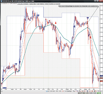FIGURE 11: VT TRADER, MOVING AVERAGE TRIOS. Here is a EUR/USD 30-minute candlestick chart displaying the moving average trio trading system.--Chris Skidmore