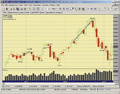 WEALTH-LAB: Tandem Studies On Market MovementAs Dima Vonko noted in his article in this issue, "Tandem Studies On Market Movement," his formulas "presuppose the correct selection of the turning points." That is, either the trader has to provide his/her own interpretation of a chart, carefully segmenting it into "market phases," or the trading system has to locate those turning points automatically.