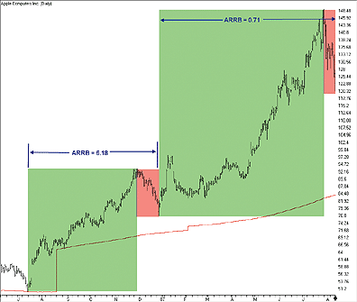FIGURE 4: AIQ, ACCUMULATED RANGE RATIO BULL ON AAPL (TOP 10%). This demonstrates mechanical identification of the major phase and four subphases with the ARBB indicator computed for each subphase.The code can be downloaded from the AIQ website at www.aiqsystems.com and also from www.tradersedge systems.com/traderstips.htm. It can also be copied and pasted from the STOCKS & COMMODITIES website at www.Traders.com.