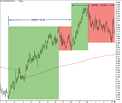 FIGURE 5: AIQ, ACCUMULATED RANGE RATIO BULL ON ATVI (BOTTOM 10%). This demonstrates mechanical identification of the major phase and four subphases with the ARBB indicator computed for each subphase.