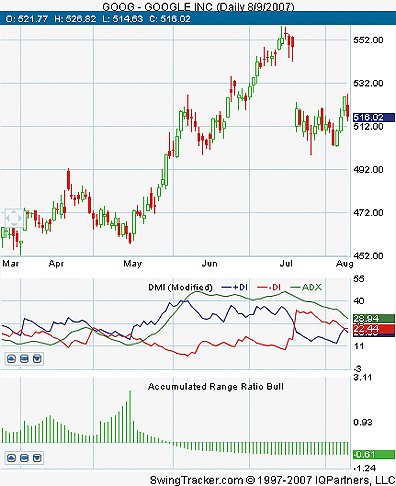 FIGURE 8: SWINGTRACKER, TANDEM STUDIES ON MARKET MOVEMENT. Here is an example of Dima Vonko's accumulated range ratio bull indicator in SwingTracker. It uses the DMI for trend filtering.To discuss this tool, please visit our forum at forum.mrswing.com. For support, our development staff will be happy to help at support.mrswing.com. To view the code, go to the Traders' Tips area of www.Traders.com.For more information on our free trial, visit www.swingtracker.com.