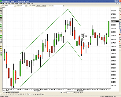As Vonko suggests in the article, the threshold value of 0.382 is used in the above formula. This value can be changed to indicate a stronger or weaker move. The formula will be calculated as listed, based on daily intervals. StrategyDesk offers simple overrides for changing the intervals if you prefer to test a different period.See Figure 9 for a sample chart. Channels have been drawn to demonstrate the initial trend and correction. The buy signal is reflected on the day where the result of the formula above exceeds 0.382.