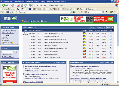 This, in part, is the idea behind Forex Factory (ForexFactory.com). This website and message-board -- accessible for free -- really only has three main components. At the top of the home page is "Today's calendar," which lets traders know about upcoming economic reports and financial announcements. What is especially nice about the calendar is that it notes not only the date and time of the announcement, but also the currency it relates to, the amount of impact or potential significance of the announcement and, where applicable, a table noting actual, forecast, and previous figures for data such as housing starts and unemployment claims.
