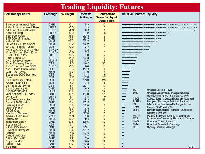 Trading Liquidity: Futures is a reference chart for speculators. It compares markets according to their per-contract potential for profit and how easily contracts can be bought or sold (i.e., trading liquidity). Each is a proportional measure and is meaningful only when compared to others in the same column. The number in the "Contracts to Trade for Equal Dollar Profit" column shows how many contracts of one commodity must be traded to obtain the same potential return as another commodity. Contracts to Trade = (Tick $ value) x (3-year Maximum Price Excursion). "Relative Contract Liquidity" places commodities in descending order according to how easily all of their contracts can be traded. Commodities at the top of the list are easiest to buy and sell; commodities at the bottom of the list are the most difficult. "Relative Contract Liquidity" is the number of contracts to trade times total open interest times a volume factor, which is the greater of: 1 or exp (1n (volume) / 1n (5000)) - 2.