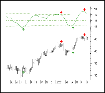 Rule 1: The start of a short-term up move is signaled when SVAPO turns up from below the lower standard deviation boundary as in the weekly chart of Hewlett-Packard (HP) in Figure 1. The same is valid for a short-term down move when Svapo turns down from above the upper standard deviation boundary.