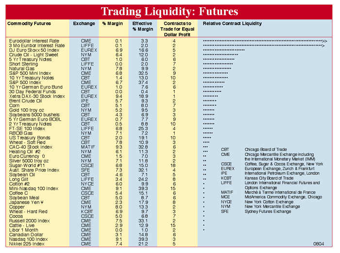 Trading Liquidity: Futures is a reference chart for speculators. It compares markets according to their per-contract potential for profit and how easily contracts can be bought or sold (i.e., trading liquidity). Each is a proportional measure and is meaningful only when compared to others in the same column. The number in the "Contracts to Trade for Equal Dollar Profit" column shows how many contracts of one commodity must be traded to obtain the same potential return as another commodity. Contracts to Trade = (Tick $ value) x (3-year Maximum Price Excursion). "Relative Contract Liquidity" places commodities in descending order according to how easily all of their contracts can be traded. Commodities at the top of the list are easiest to buy and sell; commodities at the bottom of the list are the most difficult. "Relative Contract Liquidity" is the number of contracts to trade times total open interest times a volume factor, which is the greater of: 1 or exp (1n (volume) / 1n (5000)) - 2.