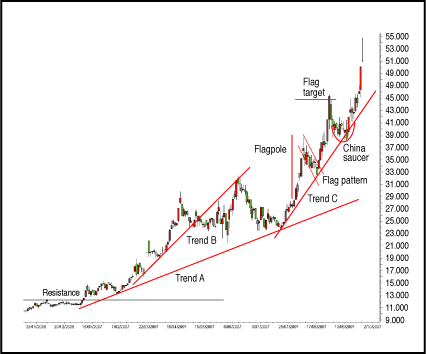 The Shanghai-listed Jiangxi Copper (Figure 1) shows a complex level of trend behavior and pattern development (note that all China stocks are shown with a China chart display: red = up). Trendline B defines the trend break starting in March 2007. This support line is broken in May 2007, and it provides a resistance point for the rally peak in June 2007.