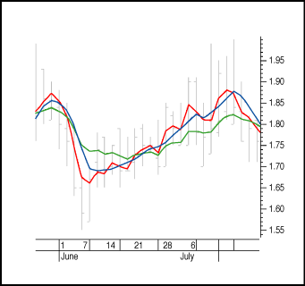 - The red line represents the 10-day TEMA (triple exponential moving average). You can see that this average responds quickly, but there's not enough smoothing. It's almost as choppy as the closing prices.