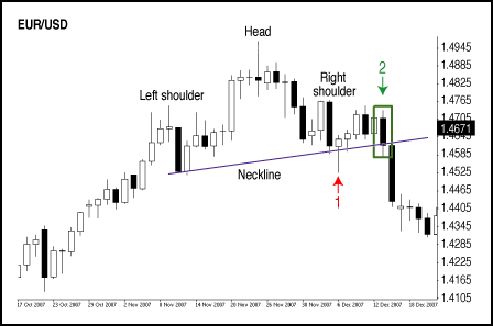 FIGURE 1A: EUR/USD AND PATTERN BREAKOUTS. Even though prices broke out of the neckline, the first breakthrough was fake.MOVING AVERAGE CROSSOVERS