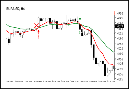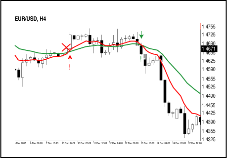 FIGURE 2A: EUR/USD AND MOVING AVERAGE CROSSOVERS. The EUR/USD pair shows a moving average crossover, but it is not confirmed by the USD/CHF. When a sell signal later appears on the EUR/USD, what does the chart of the USD/CHF tell you?Undoubtedly, the application of allies is not restricted to the forex market. In the same way you can track price movement on Brent, with crude light sweet oil, heating oil, and natural gas in the commodity markets. In the stock market you could follow the price movement of two or three ally stocks, commonly referred to as pairs trading. In the case of stocks you can trade just the stock that lags behind the one showing a distinct signal. When you come across a scenario where the signal has worked on one financial instrument but nothing is happening on the second, the best thing to do is to stay out of the market and either wait for two confirming signals to develop or move on to something else.