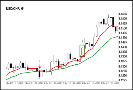 FIGURE 2B: USD/CHF AND MOVING AVERAGE CROSSOVERS. The USD/CHF shows no moving average crossover. It shows us that the trend is steady. So when the moving average crosses the second time in the EUR/USD chart, the continuation of the trend is confirmed. Hence, you can open a position.Alexander Sabodin is a consultant for ForexLine Company in Belarus. He may be reached at www.fxline.by.