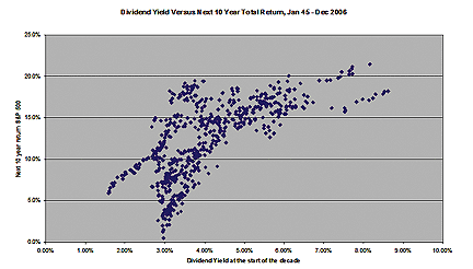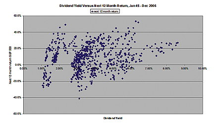 At any rate, since dividends are by definition part of total return (although in fairness, I looked mostly at changes in the S&P 500 excluding dividends), it should be no surprise that dividend yield would be correlated with subsequent return. This observation, of course, must be tempered with the observation that extremely high dividend yields sometimes signal a company in distress that must be forced to slash or eliminate the dividend, and that may suffer a loss in share price that would offset dividends collected during the holding period. Establishing correlation is not necessary if the independent variable is part of the dependent variable; the question is only whether an efficient market corrects for aberrantly high or low dividends, "correctly" driving down share prices of distressed companies (or a distressed market of stocks) to reflect poor future returns. The historical record seems an unequivocal no; investors who drive down share prices, driving up yields, have overshot to the downside. Conversely, optimistic investors who drive share prices up to excessively relative to dividend yields are incorrect in their assumption that paltry dividend yields will be offset by proportionally greater returns from capital gains.