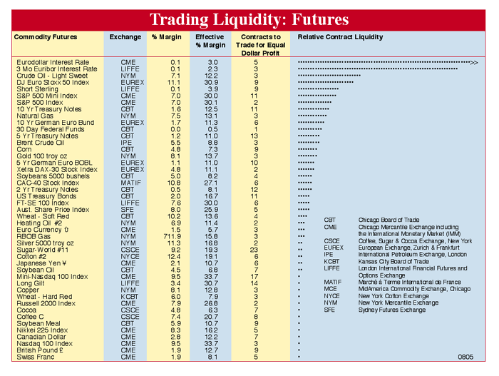 Trading Liquidity: Futures is a reference chart for speculators. It compares markets according to their per-contract potential for profit and how easily contracts can be bought or sold (i.e., trading liquidity). Each is a proportional measure and is meaningful only when compared to others in the same column. The number in the "Contracts to Trade for Equal Dollar Profit" column shows how many contracts of one commodity must be traded to obtain the same potential return as another commodity. Contracts to Trade = (Tick $ value) x (3-year Maximum Price Excursion). "Relative Contract Liquidity" places commodities in descending order according to how easily all of their contracts can be traded. Commodities at the top of the list are easiest to buy and sell; commodities at the bottom of the list are the most difficult. "Relative Contract Liquidity" is the number of contracts to trade times total open interest times a volume factor, which is the greater of: 1 or exp (1n (volume) / 1n (5000)) - 2.