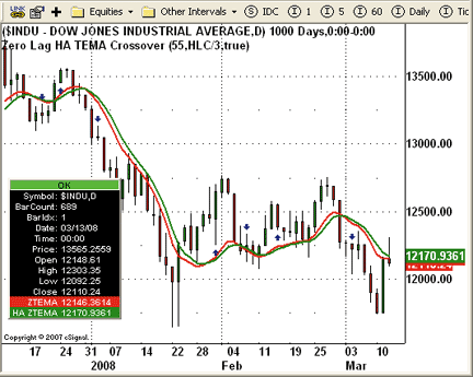 FIGURE 3: eSIGNAL, TEMA CROSSOVER. This eSignal Advanced Chart displays the HA Zero Lag TEMA study.