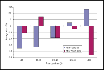 Stock prices tend to fluctuate dramatically after the market close, when companies release important news or statements. Find out how you can understand and determine the relationship between after-hours activity and the following day's closing price.After-hours trading" refers to trading activity that takes place after normal trading hours from 9:30 am to 4:00 pm Eastern time. With the development of electronic communication networks (ECNs) and the availability of online after-hour trading provided by brokerage firms, investors and traders are able to take part in after-hours trading. Stock prices tend to fluctuate dramatically during the after-hours period when companies release important news or statements following the market's close. Poor earnings announcements or other unfavorable news may immediately drive the price down significantly. Conversely, good news may boost demands for the stock. Understanding and determining the relationship between an after-hours price movement and the following day's closing price will provide valuable information to savvy traders. This article studies the effect of an after-hours price movement on the next day's closing for the underlying stocks. It is the second of a systematic study of stock market price patterns. (See my July 2007 S&C article for the first.)