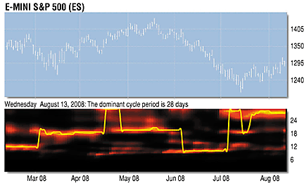 FIGURE 1: SPECTRUM CHART. The thin horizontal yellow line shows the ideal condition. Fuzzy areas in the spectrum mean that cyclic energy is not concentrated at the dominant cycle. Sometimes the dominant cycle shifts up or down, slowly as well as rapidly. The market, however, is often not so accommodating. You will see periods where the spectrum gets fuzzy; that means the cyclic energy is not concentrated at the dominant cycle and is more vague. You will also see times when the dominant cycle is drifting upward or downward, signifying slow changes in the cycle periods.