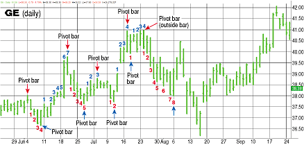 FIGURE 1: MEASURING PERSISTENCE AND IDENTIFYING PIVOT BARS. This blue numbers measure the number of higher highs in an uptrend and the red numbers measure the number of lower lows in a downtrend. I, however, believe that market movements are the result of knowledgeable participants reacting to information impulses and trading accordingly. In this view, market persistence is an expression of the sentiment of market participants over a period of time. Participants make conscientious decisions to buy and sell and are influenced by previous activity.