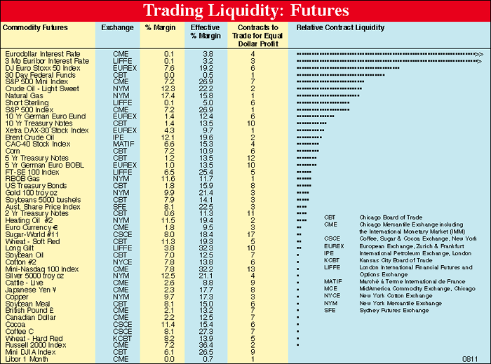 Trading Liquidity: Futures is a reference chart for speculators. It compares markets according to their per-contract potential for profit and how easily contracts can be bought or sold (i.e., trading liquidity). Each is a proportional measure and is meaningful only when compared to others in the same column. The number in the "Contracts to Trade for Equal Dollar Profit" column shows how many contracts of one commodity must be traded to obtain the same potential return as another commodity. Contracts to Trade = (Tick $ value) x (3-year Maximum Price Excursion). "Relative Contract Liquidity" places commodities in descending order according to how easily all of their contracts can be traded. Commodities at the top of the list are easiest to buy and sell; commodities at the bottom of the list are the most difficult. "Relative Contract Liquidity" is the number of contracts to trade times total open interest times a volume factor, which is the greater of: 1 or exp (1n (volume) / 1n (5000)) - 2.
