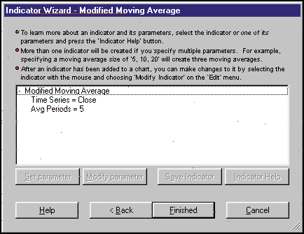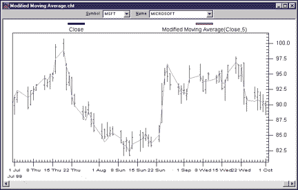 For modified moving averages longer than three days, the equations become quite complex even when simplified, and it becomes desirable to use the capability of a programming language to build a general purpose modified moving average indicator. NeuroShell Trader supports calling dynamic link libraries (DLLs) as custom indicators. So to simplify things, we have programmed a custom indicator that will allow you to implement any length of modified moving average easily.Users of NeuroShell Trader can go to the STOCKS & COMMODITIES section of the NeuroShell Trader technical support Website to download a modified moving average indicator. It is general and will allow the number of points to be specified as a parameter.
