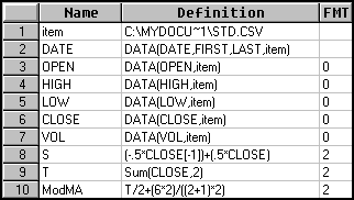 GO BACKA: DATE @TC2000(C:\TC2000\DATA,SP-500,STANDARD & POORS 500,DB) B: HIGH C: LOW D: CLOSE E: OPEN F: VOL G: Per 4 H: Avg4 @MAVG(CLOSE,PER) I: Snum ((PER-1)/2)*CLOSE+((PER-3)/2)*CLOSE[-1]+((PER-5)/2)*CLOSE[-2]+ ((PER-7)/2)*CLOSE[-3] J: ma4 AVG4+(6*SNUM)/((PER+1)*PER) K: error CLOSE-MA4 L: ==========End Formulas-- Peter Di GirolamoJerome Technology