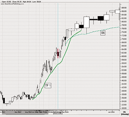 FIGURE 3: Weekly chart of OIL, the iPath S&P Crude Oil Total Return Index. A TB-F curveis fitted to the two pullbacks stradding TF1. On expiration of D, price pulls back briefly to the most proximate MIDAS support curve.