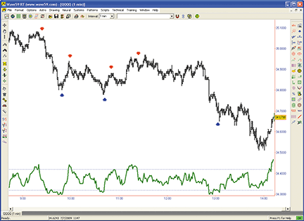 Both formulas contain the same parameters that may be configured through the Edit Studies option to change the MA, Rsi, upper, lower, and middle bands period lengths. The PidoscArrows.efs is the same study as Pidosc.efs, but it plots on the price pane and draws the corresponding arrows above/below the price bars where the Pid oscillator crosses the upper and lower bands (Figure 2).