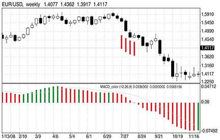 Figure 1: weekly chart of eur/usd. Here you see that the weekly histogram is moving downward.