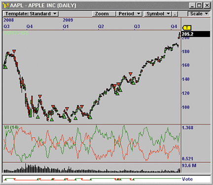 FIGURE 17: INVESTOR/RT, Vortex Indicator. A 14-period Vortex Indicator is plotted on daily bars of the S&P mini contract. The green line in the lower pane represents the +VI while the red line represents the -VI.