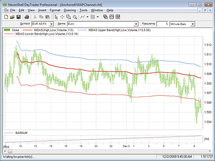 Figure 1: TRADESTATION, ANCHORED VWAP CHANNEL. Here is an example of the MidasChannel indicator applied to a five-minute chart of the euro FX contract on November 30, 2009. The upper channel line is 0.1% above the MIDAS value. The lower channel line is 0.2% below the MIDAS value. The lower pane displays trading volume.