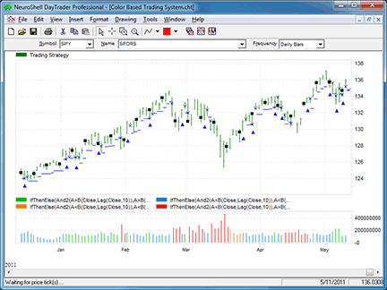 In “A Color-Based System For Short-Term Trading” in this issue, author Edgar Kraut describes a swing-trading system that utilizes the color of volume bars. It is based on the relationship of the current bar’s close and volume as compared to the close and volume 10 bars ago.